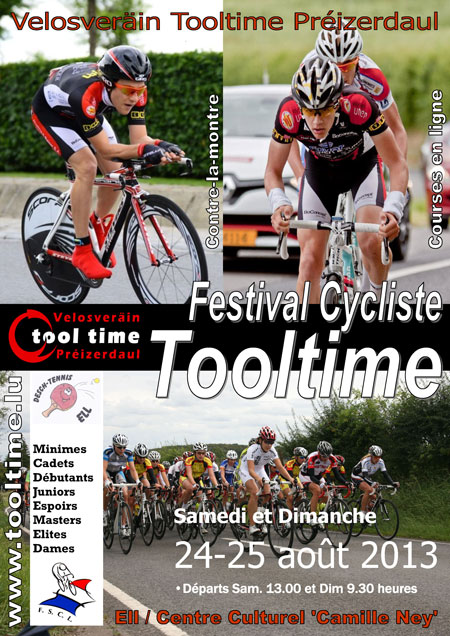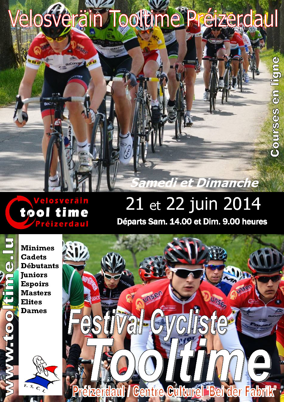 Le programme du Festival Tooltime 2014 est différent que les éditions précédentes. Les épreuves se font dans la Commune de Préizerdaul et non à Ell comme tous les années précédentes. Le samedi 21, juin sur le site de Reimberg (Rokuskapelle) se déroulera les épreuves en lignes pour Minimes et Cadets. Le lendemain 22. juin les courses en lignes pour Débutants/Dames, Masters/Juniors et Espoirs/Elites se font au Préizerdaul, départ et arrivée sur la route principale sur un tout niveau circuit magnifique de 11km. On vous invite chaleureusement à participer et on sera content de vous voir au rendez-vous.