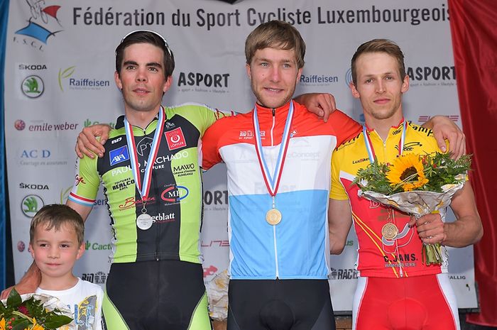 Bei den Débutants sin den Philippe LECLERC an den Félix SCHREIBER hier Zeit-Kurs gefuer, dei awer net fir zum Championnat gezielt huet. Et war eng gudd Uebung fir die 2 Coureuren. Nodems den Félix als eicht 3. gewährt gouf, ass hen awer kurz virun der Siegereierung ob die 4. Platz gesaat gin. Wirwat: den Sprecher hat do irrtümlicherweis dem Coureur den den Félix ball iwerrondt hat, durchgin. An dobei war den Félix dann awer 10’’ mei lues wei den Coureur, sou dat seng Zeit an Platz ok waren. Dem Philippe an dem Félix Merci fir är Virstellung beim CLM. Bei den Masters as den Aly SCHARTZ matgefuer. Dobei ass den Aly geint den Vergangenen Joeren eng wirkelch ganz gudd Kurs gefuer an huet sech als 15 klasseiert. Bei den Junioren war den Maxime WEIRICH um Start an as vir meng Begreffer excellent gefuer. He muss just nach e bessen mei un der Kraft schaffen, fir dat hen mat dem Braquet kann fueren. De Maxime huet engt gudd Zeitfueren gefuer och wann hen nun net esou mat senger Platz zefrieden war. Gudd Maxime. Dann hatten mir nach den Larry VALVASORI bei den Espoirs an den Mike DIENER bei der Elites ouni Vertrag an der Kurs. > De Larry as erem wei gewinnt mat enger excellent Form un den Start gangen an huet sech als 3. Espoirs klasseiert, dest hannert WIRGTEN an eisem Luc TURCHI. Fir de Luc supper fir den Virstellung. Mir hätten dir gären die 1. Platz gegont. > De Mike as erem eng excellent Kurs gefuer. No der 1 Ronn lung hen mat 13’’ Reckstand ob den ex Profi POOS Christian ob der 2. Plaatz. Des Plaatz sollt de Mike dann och bravourös bis ob Arrivée verteidigen, obwuel hen versicht huet un dem POOS seng Zeit erun ze kommen. Schlussendlech hat de Mike 30’’ Reckstand ob den routinier POOS. Supper Mike Vice-Champion am CLM.
