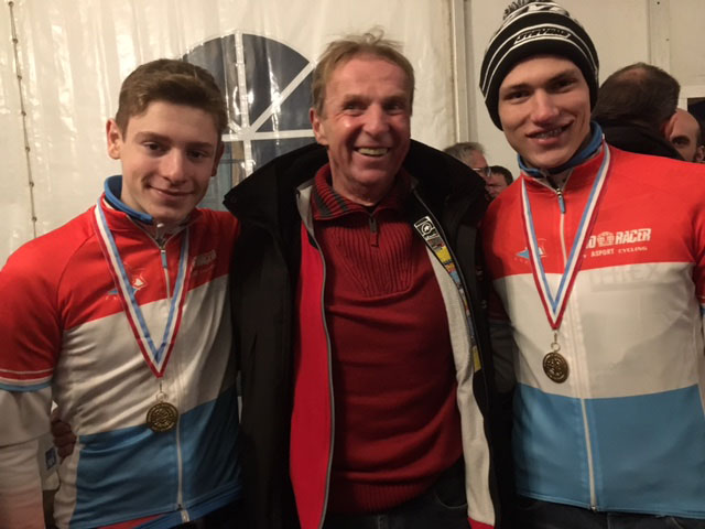 Bei der Elites/Espoirs huet de Lex Reichling och gleich am 1. Tour de Velo gewieselt an dobei och 2,3 Plaatzen verluer. De Felix Schreiber lung beim 1. Passage ob der 7 Platz. An der 2. Ronn hun de Felix an de Lex Course ugefouert. De Vincent Dias Dos Santos an den Scott Tiiltges lungen ob 3,4. Platz. De Lex huet dunn missen beim Felix lass loossen, sou dass de Felix eleng vir un der Course lung, gefolegt dun vum Soeren Nissen dem Vincent, Lex an dem Scott. No etwa 1/2 Course lung den Soeren eleng an der Verfolgung vum Felix an huet ob de Felix 2 Ronnen virun Schluss ob de Felix obgeschloss. An der leschter Ronn huet de Soeren sech am Besch vum Felix ofgesat. An der Wiss konnt de Felix awer kurz obschleissen; huet dun awer eh sie ob Strooss koumen e klengen Fehler gemach, wou bei hien de Kontakt zum Soeren verluer huet. Fir den Titel bei den Espoirs war de Felix zu kengem Moment an der Course a Bedrängnis vun dem 2., dem Misch Leyder. E scheinen nationalen Titel fir den Felix Schreiber. Felicitatioun !